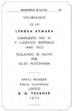 Vocabulario de la lengua aymara compuesto por el P. Ludovico Bertonio. Publicado de nuevo por Julio Platzmann, Parte primera, Edición facsimilara, Leipzig, B. G. Teubner, 1879. + Parte segunda, Edición facsimilara, Leipzig, B. G. Teubner, 1879.