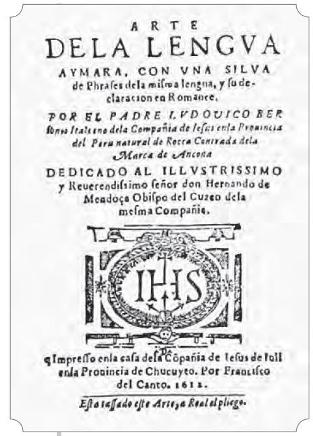 9. “Arte y grammaticamvy copiosa de la lengvaaymara. Con muchos, y varios modos de hablar para su mayor declaración”, Roma, por Luis Zanneti, ano de 1603. Esta obra fue reeditada, con las correcciones debidas, en 1612 en el Perú, bajo el título“Arte de la lengva aymara, con vna silva de phrases de la misma lengva, y su declaración en Romance", Impresso en la casa dela