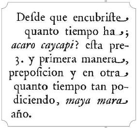 Para usar bien de el es menester, que algunas de las personas con quien hablamos, o la que habla, no aya visto lo que va contando; o que cuenta, que hizo algo como por olvido, vg; Viernesana aycha mankatavitha, por olvido comi carne en Viernes. Vcahama satavina, yatichatavina, assi lo dixo, y ensenó, o assi lo avia dicho y ensenado; de donde proviene, que sea frequentissimo en los Sermones este modo de hablar (§ 13).