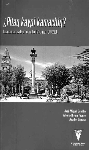 Por eso el trabajo de Gordillo, Rivera y Sulcata (2007) aporta significativamente al tema desde el análisis de las estructuras de poder en Cochabamba, cuyo recorrido pasa por su origen republicano con resabios coloniales y desemboca en los efectos del neoliberalismo. ¿Pitaq kaypi kamachiq?, título que lleva el libro, repara en el pasado con una mirada sociológica para poder entender las características actuales de una región de gran vitalidad económica-productiva, política e intelectual, pero carente de un proyecto societal y de elites protagónicas en dicho cometido.