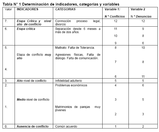 Un índice es una medida común, que agrupa varios valores de una misma dimensión conceptual la cual debe seroperacionalizada para ser en consecuencia medida, en tal sentido se asignan valores numéricos a cada variable, que indican en este caso el grado de conflicto en los procesos de divorcio y a partir del cual se determina los índices de la escalada de conflicto.59
