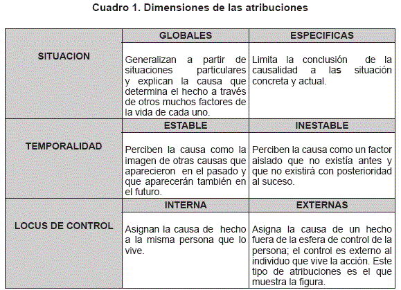 Las dimensiones que proponen como determinantes de un estilo atribucional específico son: interno versus externo; estable versus inestable y específico versus global.
