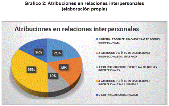 En general, los resultados en el área de relaciones interpersonales donde se aprecian porcentajes similares a nivel general de respuesta, dentro de la población que predomina con un 35 % de aceptación es el factor de atribución del éxito, en las relaciones interpersonales a la habilidad, en términos de fracaso en las relaciones interpersonales; el puntaje más alto lo tiene el factor número 1, referido a la internalización de las relaciones interpersonales (referido a atribuciones personales, deficiencias o dificultades del propio sujeto); además la Externalización del éxito en las relaciones interpersonales se muestra como el ítem con menos puntaje (el éxito no depende del otro).