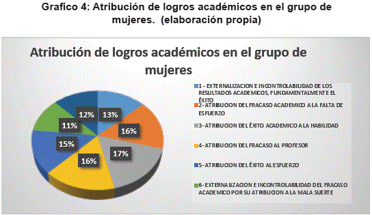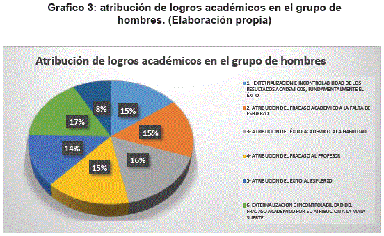 En el grupo de hombres el factor de mayor predominio en el área de logros académicos es el de la externalización e incontrolabilidad del fracaso académico, por la atribución a la mala suerte, obteniendo un puntaje de 17%, y en términos de éxito, el ítem referido a la habilidad es el más alto con un 16% y como el menor aceptado de ellos el de la atribución al fracaso académico, a la falta de habilidad con un 8%. En el caso del grupo de mujeres, los datos presentan diferencias en cuanto a la atribución de fracaso. Se presentan como factores dominantes la atribución del éxito académico a la habilidad con el 17%, además de dos factores que presentan el 16% de aceptación, como lo son la atribución del fracaso al profesor y la atribución del fracaso a la falta de esfuerzo; y como el factor menos aceptado el de la externalización e incontrolabilidad del fracaso académico por su atribución a la mala suerte.