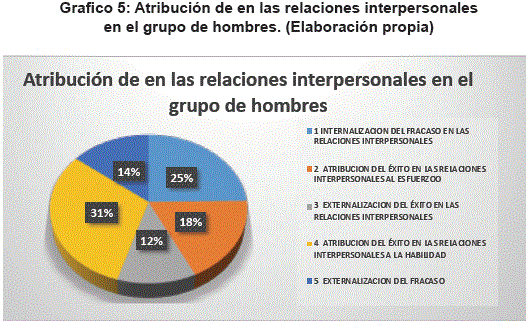 En las relaciones interpersonales, también se realizó un análisis comparativo entre los dos tipos de atribuciones; se encontró que en el grupo de hombres la atribución referida al éxito que mayor aceptación tiene es la de atribución a la habilidad con un 31%, de la misma manera, la atribución al fracaso corresponde al área de internalización, con un 25 %.