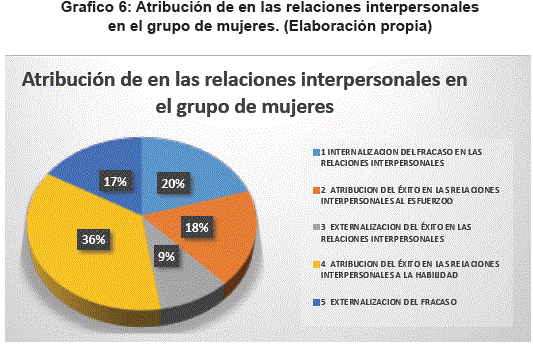 En comparación con las respuestas brindadas por las mujeres en el caso de éxito, también refirieron atribuirla a la habilidad con un 36 %, y en el caso de las situaciones de fracaso el puntaje más alto es el de la internalización del fracaso.