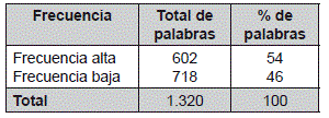 En frecuencia léxica, se identificó un total de 1.320 palabras entre frecuencia alta y frecuencia baja, las cuales fueron avaladas por los jueces para determinar si corresponden a frecuencia alta o baja, el resultado es el siguiente: