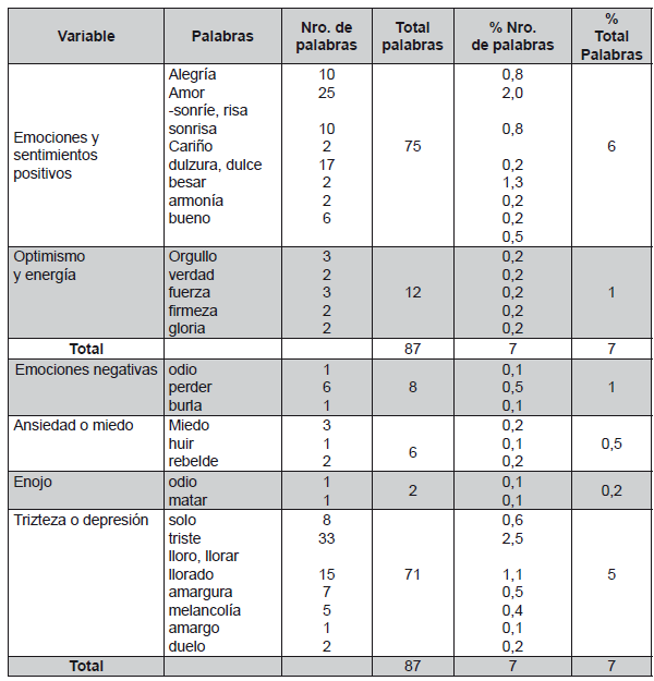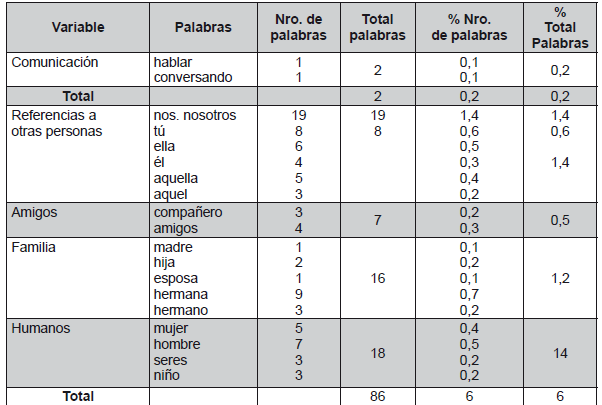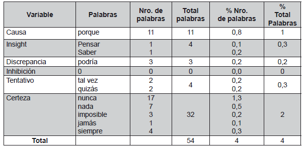 Posteriormente, para la determinación de palabras repetidas se consideró las categorías de LIWC (2001), la cual delimita qué palabras tomar en cuenta o no según sus categorías de medición, considerando el resultado total de las palabras encontradas en la frecuencia léxica son 1.320, para este efecto se consideró la categoría y las subcategorías de los procesos psicológicos de LIWC. Los resultados son los siguientes: