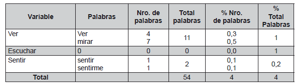 En comparación con los resultados de las otras subcategorías, como ser escuchar esta omitido, lo cual confirma la búsqueda de certeza y causa, Medinaceli formaba sus propias conclusiones de un conocimiento mediante la lectura y su alta curiosidad, lo cual demuestra además en su frecuencia léxica alta. El escuchar no era propio de su forma de ser, ni aprendizaje, por otra parte, la subcategoría sentir está por debajo del resultado alto -ver- según Escobar (2010), Medinaceli se encontraría muy alejado de los estímulos físicos, expresión de los sentimientos, practicidad, experimentación.
