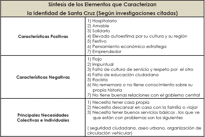 La investigación realizada nos ha permitido explorartanto conceptual como empíricamente parte del universo identitario de las élites de Santa Cruz de la Sierra partiendo del hecho de reconocerlas como una forma de identidad social, cuyos miembros además de tener una imagen de sí mismos en relación al mundo que les rodea, reconocen que parte de esa imagen es producto de la pertenencia a
