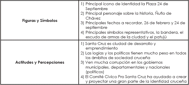 1) La ciudad de Santa Cruz de la Sierra y los procesos de comunicación que se generan en ella son espacios de construcción social que han dado lugar al desarrollo de identidades sociales basadas en su papel en la sociedad. Se mantiene esta Identidad Hegemónica que afirmaba Peña y Boshetti así como se puede decir según Castells, la identidad de las élites es una identidad Legitimadora. Es decir que la denominada élite cruceña, históricamente relacionada al podery a la construcción de un hábitus, ha sido capaz de impregnar esta identidad de manera acentuada a la creación de la identidad urbana de la ciudad.
