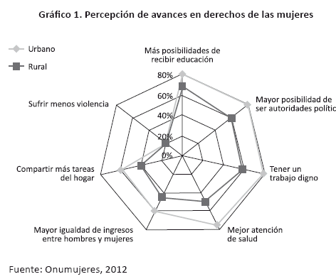 En Bolivia, Onumujeres aplicó en 2012 una encuesta a 1.200 mujeres de 18 años en adelante, de las áreas urbana y rural en los departamentos de La Paz, Cochabamba y Santa Cruz (ver Gráfico 1). Los resultados, incluidos en el Informe de la sociedad civil sobre el cumplimiento de la Plataforma y Plan de Acción de Beijing 20 años después (Chacón, 2014), presentado en 2015 ante las Naciones Unidas, confirman lo señalado anteriormente.