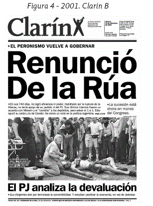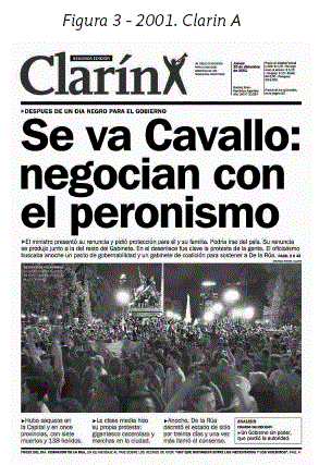 En la tapa del 20 de diciembre, Clarín destaca la protesta y la renuncia de Cavallo: "Se va Cavallo, negocian con el peronismo". Su volanta describe que fue "un día negro" para el gobierno, mientras que el copete destaca que "fue clave la protesta de la gente". Predomina una gran foto de Plaza de Mayo registrando el gigantesco cacerolazo de la clase media. Cabe destacar que la imagen está tomada a la altura del hombro amplificando la sensación de masividad. Debajo, se hacen presentes tres notas: "De la Rúa decreta el estado de sitio por 30 días" | "Saqueos en Capital y provincias con muertos heridos" | "Marchas y gigantesco cacerolazo de la clase media". La línea editorial es clara: la tapa muestra -y acompaña- el reclamo de la gente y grafica el desarme político del gobierno. La tapa del 21 de diciembre es una de las más fuertes que Clarín haya publicado: se observa una persona tirada en Plaza de Mayo, que parece muerta, y es atendida por un médico rodeado de manifestantes. El título es imponente: "Renunció De la Rúa". La volanta señala que "el peronismo vuelve a gobernar" y la bajada remarca el fracaso: "En sus 740 días, no logró eficiencia ni poder. Debilitado por la ruptura de la Alianza, no tenía apoyo de su partido ni del PJ. Sus últimos intentos fueron un acuerdo con Menem y el "corralito" a los depósitos, para salvar el 1 a 1. Esto apuró su caída y la de Cavallo. Se cierra un ciclo de la política argentina". Un segundo título señala que el PJ terminaría la convertibilidad y analizaba una devaluación.