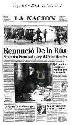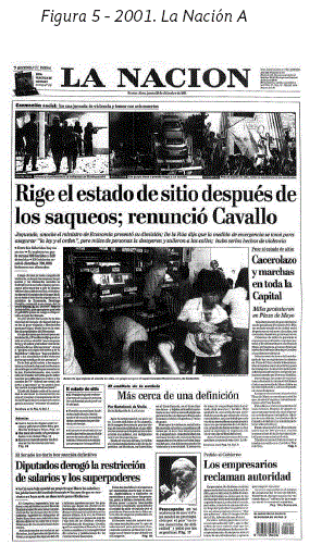 Por su parte, el 20 de diciembre La Nación titula: "Rige el estado de sitio después de los saqueos; renunció Cavallo". Una segunda nota menciona por primera vez a la protesta "cacerolazo" en su tapa: "Cacerolazo y marchas en toda la Capital". En la parte superior se encuentran tres fotos que grafican la conmoción social en diferentes lugares: Entre Ríos, Boulogne y Congreso, donde "pese al estado de sitio, miles se apostaron en la escalinata". En la edición del 21 de diciembre el título es igual al de Clarín: "Renunció De la Rúa". En la parte superior se puede ver un grupo de gente corriendo por los gases. El epígrafe explica: "Un grupo de manifestantes, que produjeron desmanes en la avenida 9 de Julio y Corrientes, es dispersado por la Policía Federal, que arrojó gases lacrimógenos, atrás avanza un camión hidrante". Se puede observar que el medio utiliza el término "es dispersado" el cual es mucho más liviano que el concepto de "represión". Este segundo día de movilizaciones callejeras y represión policial se describe en una segunda nota de tapa titulada "Veintitrés muertos y miles de heridos". El medio amplía: "La revuelta de las últimas 48 horas dejó muertos en varias zonas del país". Es interesante preguntarnos si la revuelta "dejó muertos" o si fueron asesinadas por la represión. El medio da las siguientes cifras: 9 muertes en el Gran Buenos Aires, 5 en Capital Federal, 5 en Rosario, 2 en Paraná y uno en Córdoba y Cipolletti.