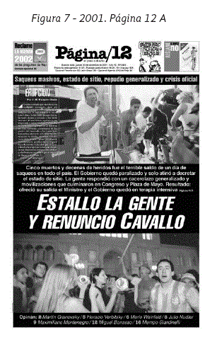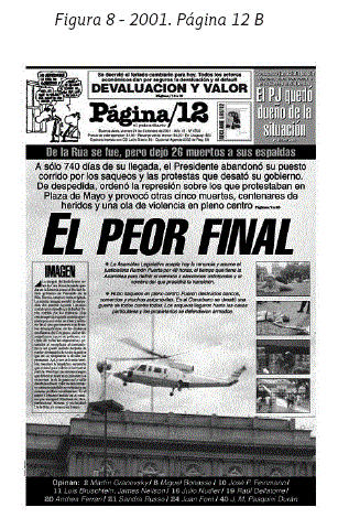 Las tapas de Página/12 son antológicas. El 20 de diciembre titula "Estalló la gente y renunció Cavallo", mientras dos imágenes muestran un cacerolazo en la Casa Rosada y la clásica imagen del supermercadista chino mirando a cámara y llorando ante un saqueo. La volanta en letras amarillas resume: "Saqueos masivos, estado de sitio, repudio generalizado y crisis oficial". En la bajada se menciona que hubo cinco muertos y decenas de heridos, y se describe al Gobierno como "paralizado" y "en terapia intensiva". Los saqueos y las movilizaciones son descritos como una "erupción". En la tapa del 21 de diciembre, se observa una segunda imagen que ha trascendido los años: el helicóptero despegando de la Casa Rosada bajo el título: "El peor final". El encuadre de la volanta vuelve a destacarse en letras amarillas sobre un fondo negro: "De la Rúa se fue, pero dejó 26 muertos a sus espaldas. Se entabla una serie de causa y efecto: su Gobierno produjo una crisis, la crisis generó movilizaciones y, finalmente, De la Rúa "abandonó su puesto corrido por los saqueos y las protestas que desató su Gobierno". Irónicamente se señala que "de despedida", ordenó una nueva represión que produjo cinco muertos más y centenares de heridos. Cuatro fotos más pequeñas acompañan el relato: la caballeriza reprimiendo, un camión hidrante y dos fotos con personas tiradas en el piso. Una de ellas con los ojos abiertos y la policía de fondo.