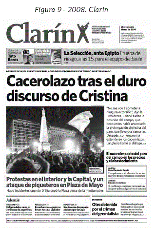 En su portada del 26 de marzo, Clarín tituló: "Cacerolazo tras el duro discurso de Cristina". El titular establece una relación de causa y efecto entre el "duro" discurso de la presidente y el cacerolazo, lo cual se amplía en la bajada: "'No me voy a someter a ninguna extorsión', dijo la presidente. Criticó fuerte la posición del campo, que poco antes había anunciado la prolongación sin fecha del paro, que lleva dos semanas. Después, comenzaron a extenderse los cacerolazos. La Iglesia llamó al diálogo". Debajo se describen los sucesos: "Protestas en el interior y la Capital, y un ataque de piqueteros en Plaza de Mayo | Hubo incidentes cuando D'Elía copó la Plaza cerca de la medianoche. También se muestra una foto con la Pirámide de Mayo de fondo en la que aparece un chico en los hombros de su papá con una bandera argentina, reforzando las ideas de familiaridad, patriotismo y "apartidismo". Asimismo, la imagen está tomada por encima del hombro del fotógrafo, lo cual genera una sensación de multitud. En su interior, el diario da el siguiente orden de relevancia a los acontecimientos: