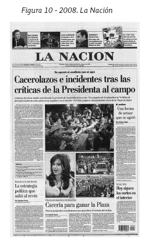 3°. El cacerolazo: fue una "reacción" o una "respuesta" de "manifestantes", seguida de un apoyo al campo y el descontento con el Gobierno. Si bien se mencionan las protestas en el interior, se enfatiza la sensación de "multitud" en Plaza de Mayo antes que su nacionalización. Se recuerdan constantemente los cacerolazos de 2001 con el fin de marcar la debilidad del Gobierno y la pérdida de apoyo de un sector de la sociedad.