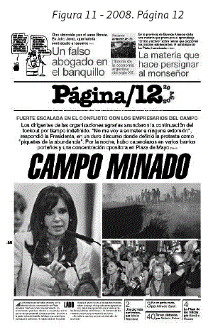 De modo diferente, Página/12 privilegia un nuevo endurecimiento en el conflicto entre la Mesa de Enlace y el Gobierno con el título: "Campo minado". Esto encuentra soporte en la volanta: "Fuerte escalada en el conflicto con los empresarios del campo". No con el campo, sino con "los empresarios" del campo. Esta diferencia se sostiene en la bajada dado que el medio arroja la responsabilidad al campo por la continuidad del "lockout" por tiempo indefinido: de este modo, el discurso fue una reacción a la medida de la dirigencia campesina. Esta idea se expresa también en la imagen, dado que más allá de mostrar a la presidente y el cacerolazo en la ciudad, se muestra también un corte de ruta.