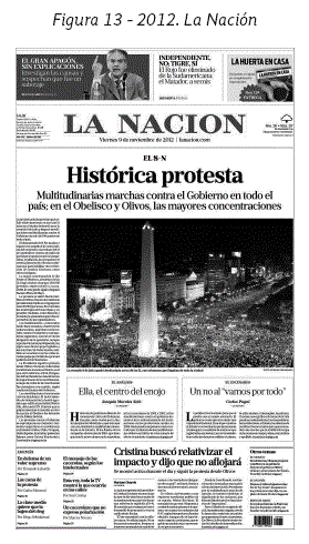 Para los tres medios el #8N fue el tema central de la jornada y lo denominaron como una "marcha" o "cacerolazo". Su abordaje y la construcción de los significados fueron coherentes con los intereses político-económicos y las ideologías de cada medio. Por un lado, los encuadres elegidos por Clarín y La Nación pusieron en evidencia la relación de tensión existente con el Gobierno, centrando sus relatos en el malestar que, según ellos, aquejaba a los argentinos: la inflación, la inseguridad, las medidas cambiarias, los gestos autoritarios y los deseos de re-reelección de la expresidente. Asimismo, posicionaron a Cristina Kirchner como la antagonista del bienestar social, y la caracterizaron como "soberbia", "autoritaria", "errática" y "solitaria". En algunas notas incluso se deslizó la posibilidad de que la presidente tenía problemas psiquiátricos. Las estrategias lingüísticas utilizadas por La Nación y Clarín fueron frases emotivas para defender valores supremos como la libertad y la igualdad, además de ironías y metáforas con las que ridiculizaron a la expresidente. También vincularon la protesta con sentimientos patrióticos y, se puso el acento en el carácter autoritario del gobierno y en la importancia de movilizarse en democracia.