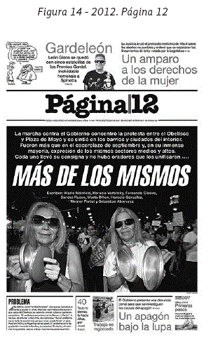 Finalmente, Página/12 volvía a posicionarse del lado del Gobierno. A diferencia de los otros medios, no muestra una imagen panorámica, sino a dos mujeres rubias con anteojos de sol golpeando tapas de ollas con gente detrás bajo el título "Más de los mismos". El medio intenta construir que las clases medias y altas protestaron contra un gobierno popular, a su vez que se destaca la desorganización de las consignas. Paradójicamente coincide con Clarín en que "se sintió en los barrios y ciudades del interior" y que "fueron más que en el cacerolazo de septiembre".