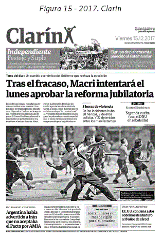 El 15 de diciembre, Clarín refleja el conflicto en tapa, aunque no le otorga la portada completa como tal vez ameritaba la principal represión desde 2001. En la portada, el título informa "Tras el fracaso, Macri intentará el lunes aprobar la reforma jubilatoria", mientras una foto muestra en primer plano a un hombre con la remera de un club de fútbol tirando un proyectil y en segundo plano se ven cinco hombres en posición similar con palos. El encuadre del medio intenta construir un acontecimiento en el cual un grupo de manifestantes y gremios violentos impidieron la votación. Nunca se da cuenta de la multitud que se aglutinó desde el mediodía y se dispersó con el accionar represivo de la Gendarmería que jugó un rol central en el "fracaso" de la votación. De modo contrario, en la bajada sí se informa que "las fuerzas de seguridad reprimieron con gases y balas de goma", mientras que un recuadro se habla de "8 horas de violencia" e "incidentes", dando a ambos sectores la misma responsabilidad en el conflicto y señalando que de los 30 heridos 9 fueron policías. Sin embargo, en el interior se observa una distancia entre la línea editorial expresada en la tapa y los periodistas: mientras la portada intenta construir un escenario de violencia por parte de los manifestantes, en el interior los periodistas sí reflejan el accionar de las fuerzas represivas. Incluso las fotos muestran en varias oportunidades a las fuerzas de seguridad reprimiendo y se informan números que dan cuenta de la magnitud: "En el operativo de ayer en el Congreso participaron más de 1.700 efectivos. Estaban distribuidos así: 900 eran gendarmes, 280 de la Policía federal, 110 de Prefectura Naval, 78 de la Policía de Seguridad Aeroportuaria y unos 330 de la Policía Metropolitana. A eso hay que sumarle unos 70 agentes de tránsito". Es interesante que de todos modos se cuidan de mencionar la palabra "represión": se describe al acontecimiento como un "escándalo", "escenario de guerra", "batalla campal", "descontrol", "militarización" y "golpe político". Se destaca la columna de Marcelo Bonelli que cuestiona la "intransigencia" del Gobierno y el "error fiscal" cometido con la Reparación Histórica.