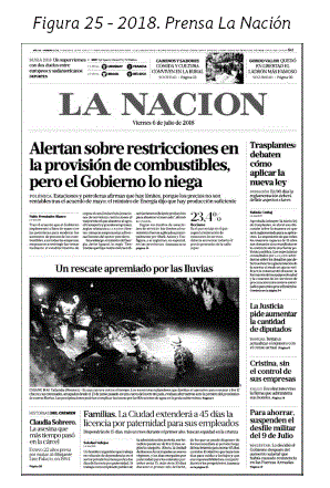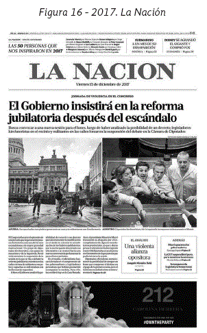 Por su parte, La Nación también dedicará la tapa al conflicto y tendrá el encuadre más cercano al Gobierno y en contra de la manifestación. El título coincide con el de Clarín: "El Gobierno insistirá en la reforma jubilatoria después del escándalo". La volanta señala que fue una "jornada de violencia en el Congreso", mientras que la bajada culpa de la suspensión del debate a "legisladores kirchneristas en el recinto y militantes en las calles". Presenta dos fotos: la primera muestra desde atrás a tres manifestantes arrojando piedras fuera del Congreso y la segunda a cinco legisladores gritándole al presidente de la Cámara de Diputados (que no se ve dado que el ángulo está cerrado). Se leen dos epígrafes: "Afuera: Encapuchados con piedras generaron el caos y se enfrentaron con Gendarmería" | "Adentro: Diputados kirchneristas y de la izquierda increparon violentamente a Monzó". En el interior, La Nación presenta la cobertura más oficialista de los tres medios. El diario muestra seis fotos: ninguna de la Gendarmería reprimiendo. Es más, la palabra "represión" sólo se menciona en tres oportunidades y se utilizan sinónimos como "repeler", "disuadir", "despejar" o "impedir". El diario construye con mucho énfasis un escenario de "violencia" por parte de los manifestantes: "enfrentamientos", "incidentes", "caos", "desmanes", "agitación" o "choques". Se destaca constantemente que los sucesos ocurrieron "dentro y fuera del Congreso" y el cintillo que atraviesa la cobertura a lo largo de todas las páginas habla de "tensión política". Resulta muy interesante destacar el editorial de La Nación "La violencia y el peligro de regresar al pasado", cuya bajada resume: "Más que una reacción contra el proyecto de reforma previsional, los graves disturbios de ayer constituyeron un ataque a la democracia y a las instituciones".
