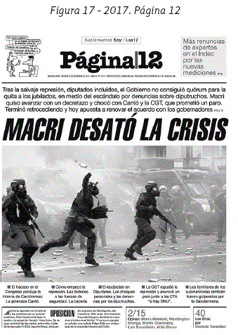 Finalmente, Página/12 pasa de la "angustia" por la victoria del macrismo en las elecciones legislativas a señalar en el título que "Macri desató la crisis". La bajada agrega que hubo una "salvaje represión" y que la votación fue un "escándalo por denuncias sobre diputruchos". En los destacados se lee que la sesión fue un "fracaso" y un "escándalo" y se compara a la represión con una "cacería". Mientras Clarín y La Nación muestran a los manifestantes arrojando proyectiles, Página/12 pone la foto de tres gendarmes reprimiendo con máscaras y armas largas. El mensaje es claro: más allá de la imagen, la palabra "represión" aparece cuatro veces en la tapa. En su interior, es el diario que más espacio destina a la cobertura del acontecimiento y, en las antípodas de La Nación, señala constantemente la represión a través de todos sus periodistas. Incluso se muestran recuadros con diferentes momentos entre los que se destaca al fotógrafo Pablo Piovano que recibió 12 balazos de goma. Es destacable la cantidad de material fotográfico, exactamente 21 fotos: 14 de ellas sobre la represión, ocho que muestran a las fuerzas de seguridad actuando y ninguna de los manifestantes arrojando proyectiles.