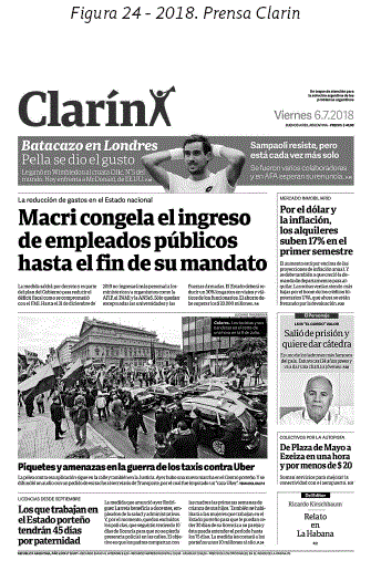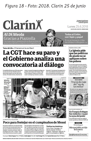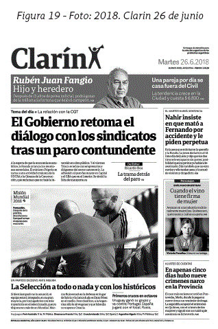 En su tapa del 25 de junio, Clarín titula: "La CGT hace su paro y el gobierno analiza una convocatoria al dialogo". La bajada destaca que "no habrá subtes, colectivos ni trenes ya que el transporte se pliega a la protesta" y la declaración del ministro Jorge Triaca de que "el paro no sirve para nada". También se menciona el corte de accesos llevado a cabo por la izquierda. En línea con el imaginario de que la CGT le hace más paros a gobiernos no peronistas, la volanta señala que es "el tercero en la era Macri". En el interior se repetirá la importancia de los servicios: "Se espera tenga un alto acatamiento debido a que no habrá trenes, colectivos ni subtes. La falta de transporte garantizará que se paralicen actividades en las que el acatamiento podría ser menor, como el comercio o la educación privada". Ya el día 26 de junio, Clarín titula en tapa: "El gobierno retoma el diálogo con los sindicatos tras un paro contundente". Es llamativo que sólo la mitad de la tapa está destinada a la protesta y no hay una foto como suele hacerse durante los paros generales. La última oración de la bajada señala: "Se sintió la falta de transporte". En el interior de la edición se califica al paro como "fuerte", se muestran imágenes de la Ciudad vacía, se replican las voces oficiales, se informa que hubo negocios abiertos y se ubica al sindicalista "Pollo" Sobrero en el semáforo rojo. En resumen, Clarín le da importancia al acontecimiento más en la extensión de la cobertura en el interior del diario que en la tapa, donde no publica ninguna foto. Se refleja la contundencia, pero se responsabiliza al paro de transporte y una nota muestra que aun así hubo actividad. También se remarca el clivaje peronismo-antiperonismo señalando varias veces que es el tercer paro general durante el Gobierno de Mauricio Macri. Se les otorga gran veracidad a las voces del oficialismo y se construye la imagen de un Gobierno abierto al diálogo.
