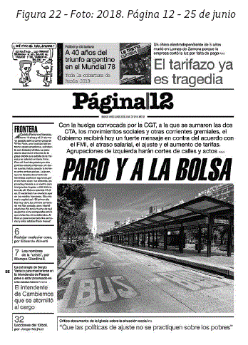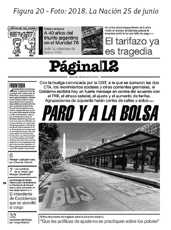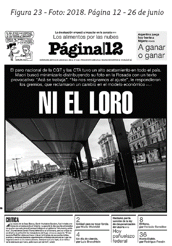 A diferencia de los otros diarios, el día 25 de junio Página/12 adhiere al paro y no tiene edición. En la tapa del 26, titula "NI EL LORO" con una imagen de la estación Constitución vacía, que ocupa casi toda la página. Se menciona el "alto acatamiento" al paro y se señala la intención del presidente de minimizarlo a través de sus fotos en la Casa Rosada y su frase provocativa: "Acá se trabaja". Se incluye también la respuesta de los gremios que reclaman un cambio de rumbo: "No nos resignamos a este ajuste". En el extremo superior izquierdo se observa la tira de humor de Rudy, con un chiste que hace referencia a los dichos del ministro Dujovne sobre el costo del paro. Para Página/12, el paro es muestra de la presión acumulada por una sociedad que no tolera más las medidas económicas del gobierno y pide un cambio de rumbo. Se muestra al Gabinete como alejado de la realidad social del país e insistente en un discurso desgastado, cuyos efectos son menores en un clima económico que empieza a decaer y que no augura un futuro mejor como el prometido por el Gobierno. El paro representa un quiebre de la eficacia de la "gesta masoquista" que Macri le propone a la Argentina para crecer. Con sus "manos atadas" por el acuerdo con el FMI, y una economía que no avanza, la oposición suma aliados, incluso entre aquellos que en un primer momento fueron "transigentes" con el gobierno. Así, la situación económica debilita el discurso oficial y unió a la oposición en un justo reclamo. A diferencia de los otros medios, Página/12 hace una nota con un enfoque histórico que muestra todos los paros realizados desde la vuelta de la democracia, se cuestiona la demora de la convocatoria a un paro durante este Gobierno y se dedica un apartado a los "carneros" que no adhieren. Incluso se busca ampliar la masa de protesta incluyendo la crisis que a traviesan las pequeñas y medianas empresas: "Las pymes bajaron la persiana". En resumen, Página/12 le dedica al paro seis páginas completas, tres artículos y tres notas de opinión. Se defiende al paro como una medida razonable y anhelada ante la situación económica del país. Se refuerza el carácter popular, mostrando su diversidad y mencionando a menudo un "alto acatamiento". Las respuestas del gobierno son "sacadas del libreto" y se lo considera como alejado de la realidad del país. Cuando se habla del paro de transporte, Página/12 lo muestra como una señal de la fuerza del reclamo y no como un inconveniente para ir al trabajo como La Nación y Clarín.