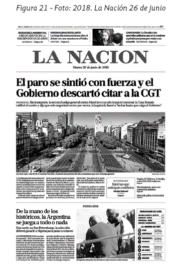 Por su parte, el 25 de junio La Nación titula en tapa: "El gobierno enfrenta hoy el mayor desafío de la CGT y ratifica el llamado a negociar". En línea con Clarín encuadra la voluntad de negociación del oficialismo. En las páginas 8, 9 y 10 se informa el acatamiento de la medida en diversos sectores de la economía, se hace un mapa de los cortes que llevarán a cabo las "organizaciones de izquierda y gremialistas combativos" y se replica el clivaje peronismo-antiperonismo señalando que es "La CGT encabeza el tercer paro contra la política económica de Macri". Se cita varias veces al ministro Triaca y figuras del gobierno que critican al paro y llaman a la pronta recomposición del diálogo, mientras que se dedica una nota a la figura de Hugo Moyano a cuya familia califican como el "Clan Moyano" que se opone por conveniencia judicial. El 26 de junio, La Nación titula "El paro se sintió con fuerza y el gobierno descartó citar a la CGT", acompañada de una imagen panorámica que muestra una 9 de julio vacía. La imagen es para el diario "el retrato más patente del alto acatamiento que tuvo la huelga general". En el interior, la nota principal muestra una imagen de Constitución desierta, bajo el título "La huelga se sintió con fuerza y el gobierno la vincula con el PJ". Una vez más, se señala la importancia de la adhesión del sector transporte para el éxito del paro y se menciona al Jefe de Gabinete, Marcos Peña, quien declara que la medida tuvo fines políticos: "Son parte de la oposición, son parte del PJ". Incluso se polemiza a través del ministro Triaca: "Una cosa es el derecho a huelga y otra interrumpir el derecho a trabajar, eso es un delito". En varias notas se señala la "desafortunada intervención" del "Pollo" Sobrero, quien pidió un plan de lucha "hasta que caiga el gobierno". Al igual que Clarín, una nota cubre el no acatamiento de varios sectores de la sociedad, con ejemplos explícitos de negocios y bares abiertos durante la huelga. Se observa a su vez consejos sobre cómo "sortear" el paro: una columna que presenta a UBER como una buena alternativa para circular, además de mapas de los cortes y detalles sobre los servicios afectados. El posicionamiento político de La Nación es aún más claro cuando se pone en duda los argumentos de la CGT.