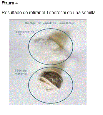 La última prueba de cantidades por gramos se hizo en diciembre de 2020. Cuando se retiró el Toborochi de una semilla, se logró trabajar con el 99%, teniendo el 1% como material inservible. Se hizo la prueba con una semilla de la cual sacamos de 9 gr de Toborochi y logramos realizar un ovillo de 8.9 gr. Hilo doble.