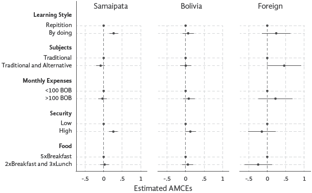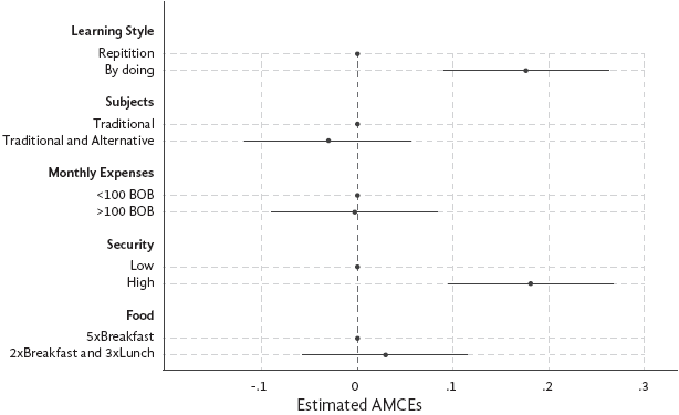 Our findings show that parents are 3.09 pp less likely to choose a school offering both traditional and alternative subjects over one with only traditional subjects. This reflects the actual enrollment patterns in Samaipata, where more children attend schools with only traditional subjects. Many parents seemed skeptical of alternative subjects, viewing them as unfamiliar and unproven, whereas traditional subjects are seen as reliable. However, some parents, especially those in private schools, valued alternative subjects for fostering creativity and motivation, as one mother noted about her child's enthusiasm for permaculture.