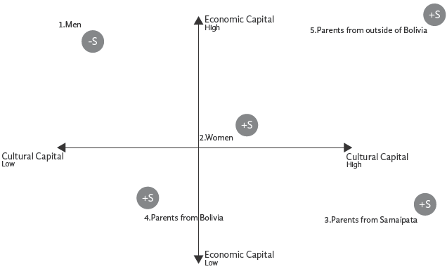 The graph shows that men in Samaipata attain a relatively low social and cultural capital, while they have a high economic capital. However, women in Samaipata attain a higher social capital than men, while they have a medium cultural capital and economic capital. Looking at places of origin, parents from Samaipata (3) tend to have a lower economic capital, while they obtain a high social and cultural capital. This is similar to parents from Bolivia (4), although these parents have a medium-level cultural capital. Lastly, parents from outside Bolivia (5) have high economic, social, and cultural capital.