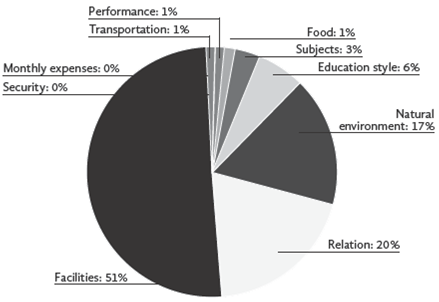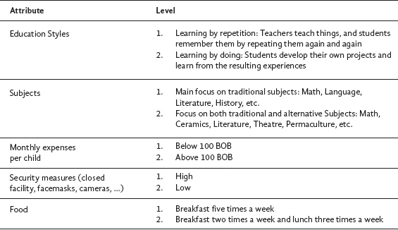 First, we found that parents are more likely to choose a school offering learning by doing rather than learning by repetition. Secondly, we found that parents prefer high over low security. Even though education style and security are the most important factors, food, subjects, and monthly expenses were also relevant, but to a lesser extent. This correlates with previous research stating that parents prioritize both education style (quality of instruction) and security over other attributes.