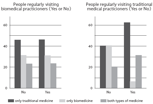 As has been previously discussed, how the social fields impact PHD, the focus now turns to how habitus influences PHD by analyzing the survey results of the general public. From the survey data, it can be seen that biomedical and traditional practitioners do not influence PHD in the same way. Graph 1 compares the PHD (different bar colors) with the type of medical practitioner that people regularly go to (the right graph for traditional practitioners and the left for biomedical practitioners). The x-axis presents people who regularly go or don't go to the corresponding type of practitioner. The y-axis shows the percentage of survey respondents making the corresponding healthcare decisions.