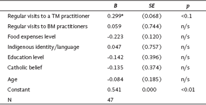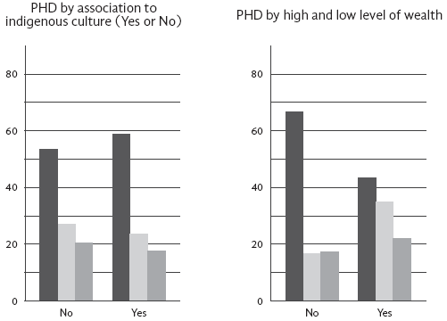 To understand the effects of cultural and economic capital on PHD, one can look at Graph 2, which shows that different levels of economic capital create bigger differences in PHD than differences in cultural capital. For example, almost the same percentage of people earn a PHD by only using traditional medicine, independently of either: 1) Their association to indigenous culture (59% percent); or 2) lack of association to indigenous culture (53% percent). On the other hand, 67% percent of people with a low level of wealth make the PHD by only using traditional medicine, compared to 43% percent with a high wealth level. Moving beyond simple descriptive statistics and focusing on linear regressions, economic capital also represents the dominant logic of capital arrangement in the field of medical pluralism, as shown by the following regression table.