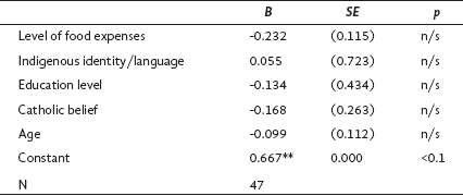 The first two regressions in the table above show the relationship between the respective type of capital and PHD without control variables. Here, it can already be seen that PHD has a stronger association with food expenses than with indigenous culture. Food expenses have a stronger correlation coefficient (-0.232 instead of 0.055) and higher statistical significance (p-value of 0.12 instead of 0.72). Turning to the control variables (Education level, Catholic belief, and Age), it can be seen that the strong association between PHD and economic capital is relatively stable with respect to all control variables, education being the strongest influence out of the three control variables (B=-0.134), and age the weakest (B=-0.099).