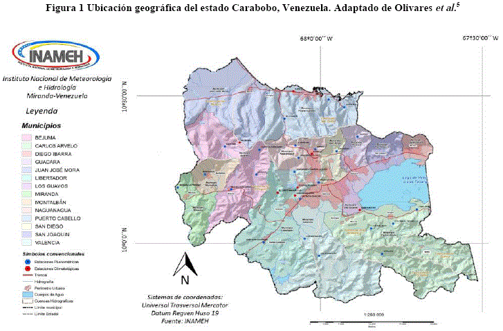 Área de estudio. El estado Carabobo está localizado en la zona centro-norte del país, entre las coordenadas geográficas 09°48' y 10°35' de Latitud Norte con 67°31' y 68°26' de Longitud Oeste (figura 1). Está constituido por catorce municipios, posee una superficie de 4651 Km2, el 42.53% (1973 Km2) es considerado como territorio potencial para la actividad agrícola.14