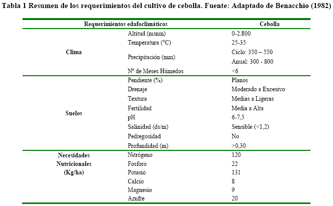 Palabras clave: Cebolla, clima, meteorología, suelos, territorio, zonificación.