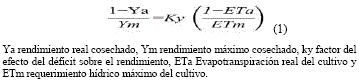 Zonificación agroecológica. La adaptabilidad de los cultivos al clima del área se determinó sobre la base de requerimientos hidricos (Eta), mediante la relación entre la disminución del rendimiento relativo y el déficit hidrico dado por el factor Ky (ecuación 1)