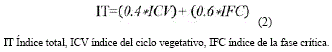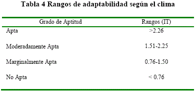 Luego, se calcularon requerimientos hídricos de los cultivos (Eta) cada rango de aptitud, tanto para el ciclo vegetativo como las etapas críticas, se compararon la oferta climática del área, definida como precipitación efectiva del 75%, de probabilidad de ocurrencia. Posteriormente, se calculó un índice de adaptabilidad climática total (ecuación 2) para determinar el grado de aptitud (tabla 4).