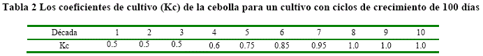 La resistencia a la sequía de la cebolla durante el transcurso de sus fases fenológicas varía, en este sentido, se observa en la tabla 2, los valores del índice Kc (coeficiente del cultivo), que aumentan según transcurren las décadas de crecimiento del cultivo según Doorenbos & Kassam24, Doorenbos & Pruitt.25