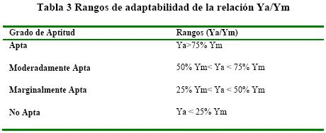 Posteriormente, se estableció un criterio general de adaptabilidad de acuerdo a la relación Ya/Ym (tabla 3).