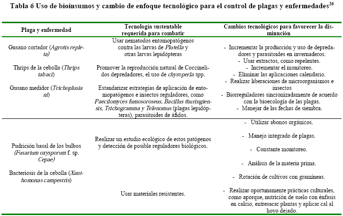 En la tabla 6 se presenta el abordaje del tema, desplegando elementos para la aplicación de tecnologías agrícolas sustentables tales como el manejo integrado de plagas y el uso correcto de cultivares que, por sus características de tolerancia a las plagas y enfermedades, permiten reducir sustancialmente la aplicación de biocidas.