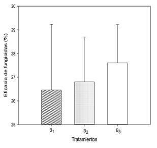 Eficacia de los fungicidas. El porcentaje de control de R. solani según los tratamientos analizados, Figura 1, reveló que B3 alcanzó una eficacia 27.60 %. B2 y B1 presentaron 26.80 y 26.46 %, respectivamente. Comparados entre sí, estos valores no difieren. El coeficiente de variación fue 22.08 %. En las variedades evaluadas, ninguna eficacia superó el 30 % con fungicidas y dosis aplicadas para el control de R. solani.