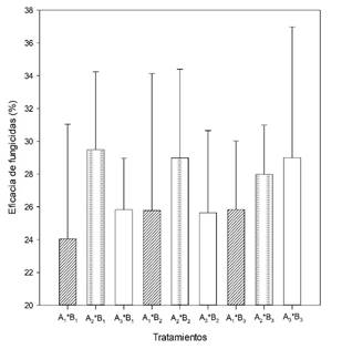 La interacción entre variedades y fungicidas no fue diferente, no obstante, en la Figura 2 se puede ver que para A2, B1 logró un control del 29.49 %. Este resultado fue similar a los obtenidos con 28.99 % y B3 27.98 % en la misma variedad. Por otro lado, en las variedades A1 y A3, los tratamientos con fungicidas reportaron eficacias que variaron entre 24.05 y 29 %. Estos valores no fueron diferentes. Además, el periodo de persistencia de los fungicidas superó los 20 días.
