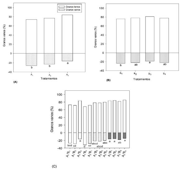 En la interacción entre variedades y tratamientos con fungicidas y dosis (Figura 3C), A3 sin fungicidas presentó 14.68 % de granos vanos, seguido por A3 con B2 que reportó 15.66 %, A3 con B1 reportó 16.26 % y A1 con B3 obtuvo 16.28 %. Los porcentajes alcanzados en estos tratamientos no manifestaron diferencias entre sí.