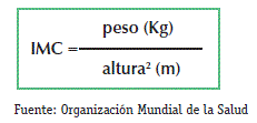 El índice de masa corporal (IMC) es considerada un parámetro que establece la condición física de una persona relacionando su peso y su estatura que se utiliza frecuentemente para identificar el sobrepeso y la obesidad en los adultos. Se calcula dividiendo el peso de una persona en kilos por el cuadrado de su talla en metros (kg/m2).
