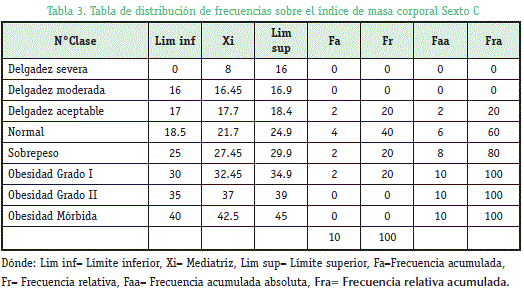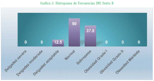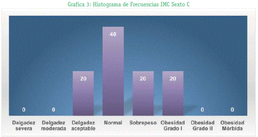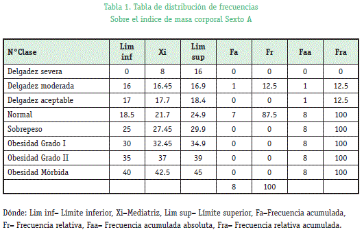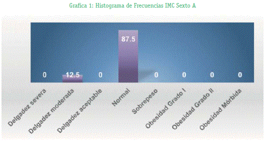 En el estudio las unidades experimentales que se utilizaron fueron los estudiantes del Colegio José Manuel Vicente Ballivian de los cursos del Sexto A, B y C que hicieron un total de 26 estudiantes y 31 personas muestreadas en la plaza triangular de la ciudad de La Paz de 20 a 32 años el proceso que se realizo fue pesar y medir a cada uno para la obtención del IMC. Para el grupo conformado por los estudiantes primero se hizo un análisis de cada curso, donde se observó en la tabla 1 (Grafico 1) que en el curso sexto A no existe estudiantes que presenten obesidad, la mayoría de los estudiantes se encuentran en lo normal de clasificación con un 87,5%y un 12,5% de delgadez moderada. En la tabla 2 (Grafico 2) donde se realizó la tabla de distribución de frecuencias de curso sexto B se observó que si hay estudiantes con sobrepeso de un 37.5% pero los estudiantes con IMC normal es aún mayor con un 50% y delgadez aceptable un 12,5% y por último en el curso sexto C ya se pudo observas que existe estudiantes con obesidad grado I que es un 20%, estudiantes con sobre peso y delgadez aceptable igual a un 20% y estudiantes con el IMC normal un 40% como se observa en la tabla 3 (Gráfico 3).