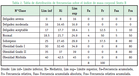 Overweight and obesity is considered a major health problem in society that has been increasing in recent years and also worldwide. a comparison was performed using the body mass index (BMI) in sixthsecondary of "Manuel Vicente Ballivian" College and adults 20 to 32 years with the participation of students of the subject of statistical 2nd year of study Pharmaceutical Chemistry UMSA. weights were obtained with a scale and height with a tape measure, once obtained this information the corresponding calculation for BMI (Body Mass Index) was conducted and the data table of frequency distribution based on a classificatión nutritional status according to WHO. Obtained by calculations and the table is noted that the Education Unit has one moderate thinness 3.85%, 11.5% acceptable thinness, 57.7% and 19.2% on average and 7.69% weight obesity degree I. And adults thinness 6.45% severe, moderate thinness 3.23%, average 45.2% 38.7% 6.45% overweight and obesity degree I. In our study it was determined that the percentage of severely underweight and overweight in-creased in people 20 to 32 years with regard to the students that due to many factors including the most important physical inactivity and poor nutrition due to lack of information on the subject.